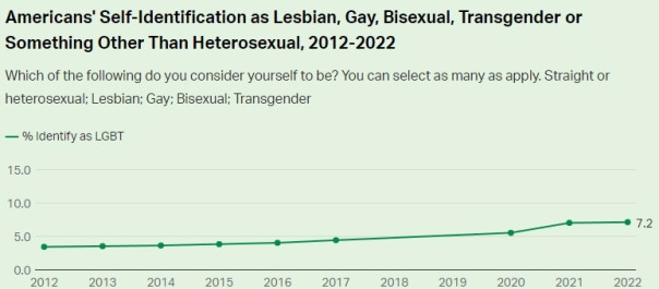 Поступили новые данные от Гэллапа по размеру популяции содомитов и трансов в США, она осталась практически на прежнем уровне - 7,2%, против 7,1% в прошлом году. Все иные показатели тоже почти одинаковые, в том числе по молодёжи, а среди неё первертов 20%.