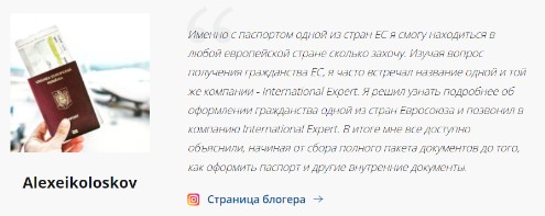 Компания International Expert — это профессионалы в сфере миграции. Специализируются на гражданстве Евросоюза для жителей СНГ. На сайте представлены также услуги по оформлению ВНЖ, ПМЖ, визы в США, открытию или релокации бизнеса в ЕС. Компания была создана в 1993 году и уже успела помочь тысячам клиентов. Получение гражданства в ЕС — это важный шаг, который стоит доверить профессионалам, а потому в этой статье рассмотрим информацию об Интернешнл Эксперт, отзывы клиентов, преимущества сотрудничества и стоит ли им доверять.