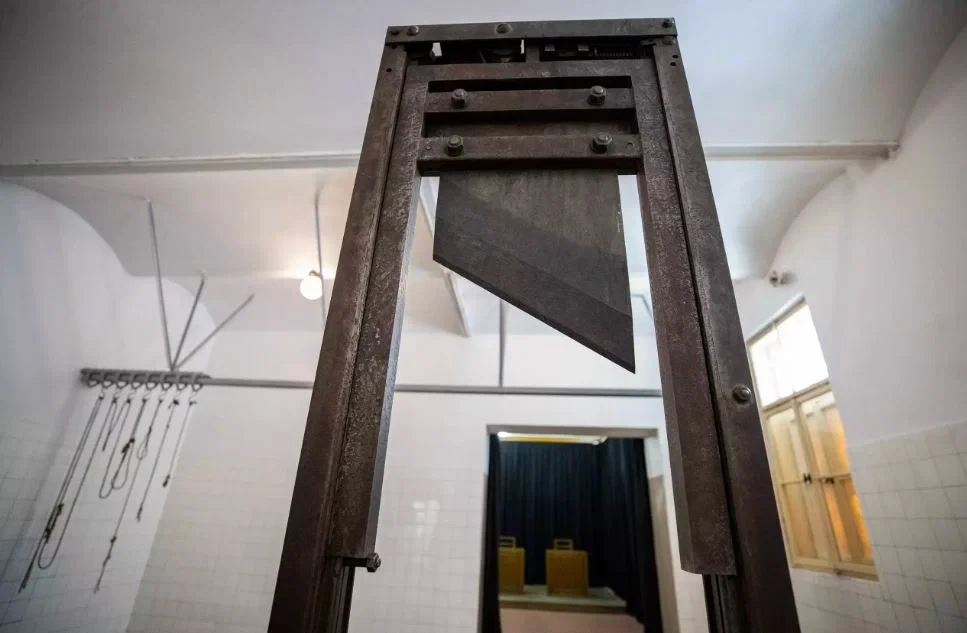 Это место до сих пор навевает ужас. Та самая гильотина и те самые веревки слева он неё, на которых нацисты вешали осужденных.