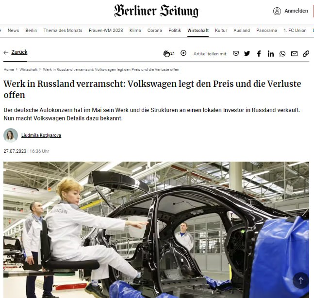 Berliner Zeitung: немецкий автоконцерн понёс €400 млн убытков от закрытия бизнеса в России.