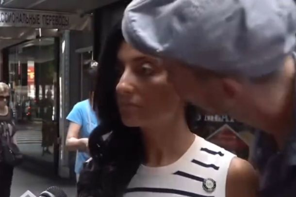 Здесь же речь идёт о том, что член городского совета Нью-Йорка Инна Верникова давала интервью репортёру Ханне Клигер с телеканала CBS New York на Брайтон-Бич в Бруклине, а к ней неожиданно подошёл неизвестный мужчина в серой кепочке, наклонился и поцеловал. В щёку. В прямом эфире.