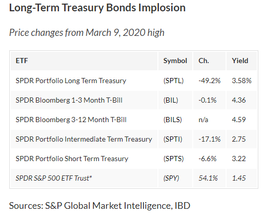 The SPDR Portfolio Long-Term Treasury ETF (SPTL), which owns U.S. government debt maturing in at least 10 years, plunged more than 49% in price from its high in March 2020.