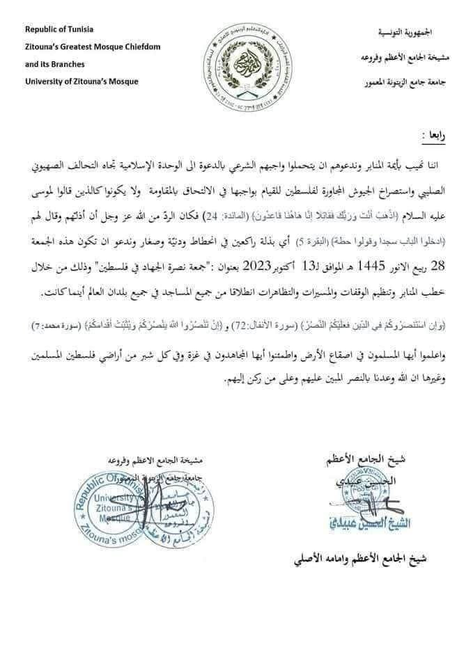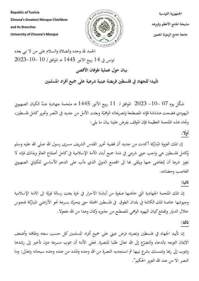 В Великой Мечети Туниса аз-Зайтуна (мечеть олив) и крупнейшем исламском богословском университете Африки приняли фетву с объявлением Израилю джихада.