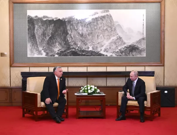 Президент РФ Владимир Путин и премьер-министр Венгрии Виктор Орбан (слева) во время встречи в Пекине