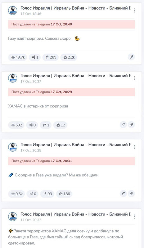 Израильские паблики, которые ещё недавно радовались удару ВВС Израиля по больнице в Газе, лихорадочно трут свои посты.