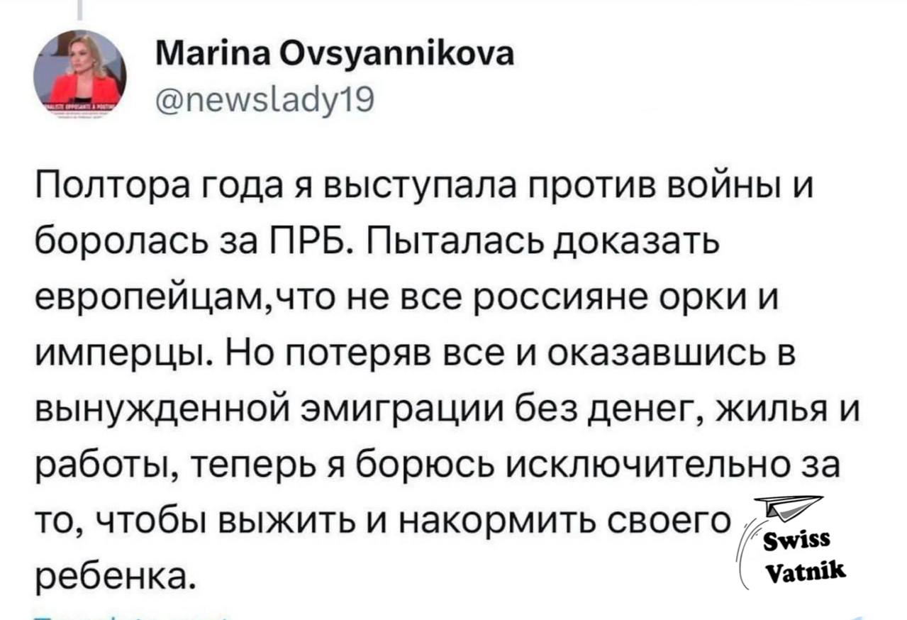 Не Вы Госпожа Овсянникова первая, не Вы последняя! Просто в сравнении с другими убежантами, которые трусливо свалили из страны, но держали свой рот на замке - их хотя бы немного жаль, не ведали, что творили! А Вас, госпожа Овсянникова ни разу не жаль! Вы сидели в кабинете редактора и терпеливо ждали свой выход, отлично понимая, что своим плакатиком подставляете коллег по работе!