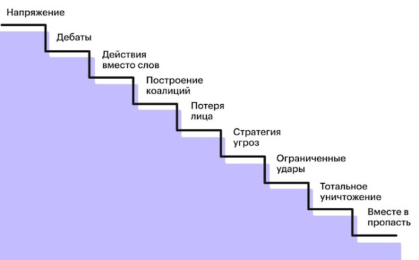 Лестница эскалации американского теоретика этапов мировых кризисов Германа Кана была разработана в 70-х гг. прошлого века, но до сих пор не утратила своей актуальности в части «сверки часов» с тем временем, которое остается до полного краха человеческой цивилизации