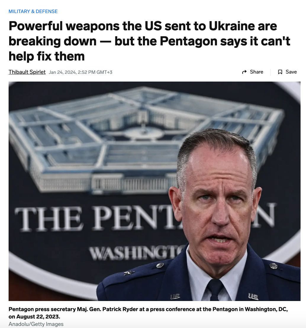 «Представитель Пентагона сообщил, что американское оружие, переданное Киеву, даёт сбои, потому что Соединённые Штаты не могут помочь украинцам в его ремонте.