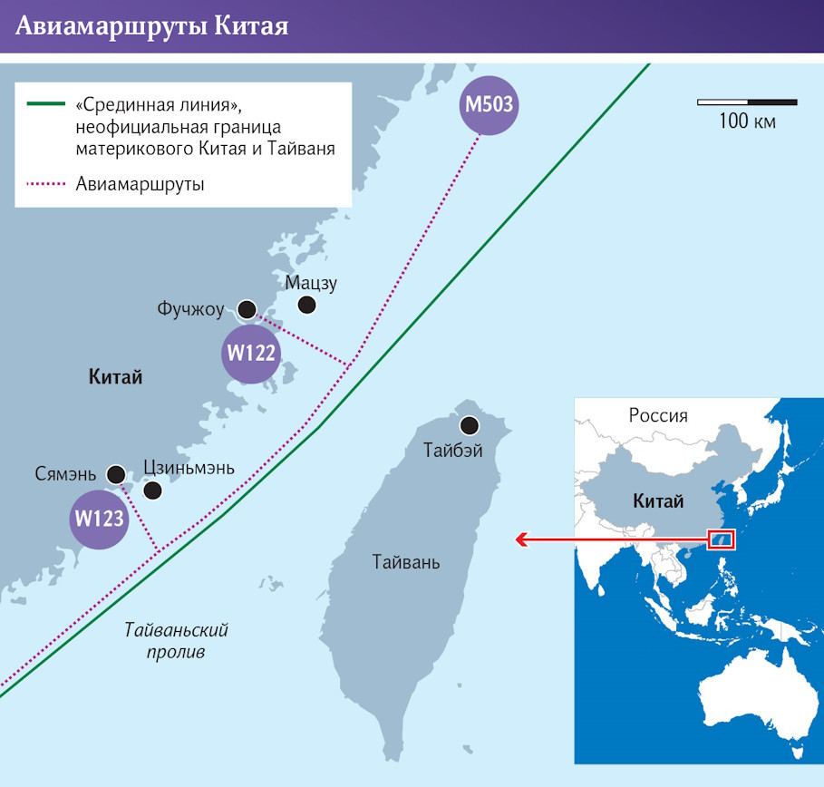 В Китае, который считает Тайвань своей провинцией, решили сдвинуть один из авиамаршрутов для коммерческих самолетов над акваторией пролива. В Управлении гражданской авиации заявили, что с 1 февраля отменяют «компенсационную меру» для полетов по южному направлению. Речь идет о маршруте М503, который пролегает практически вдоль срединной линии в проливе, неофициальной границы с Тайванем. В основном он связывает китайские города с Юго-Восточной Азией.
