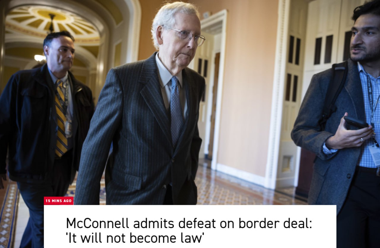 Politico пишет, что лидер республиканцев в Сенате Митч МакКоннелл признал, что компромисс по границе и помощи Украине, Израилю и Тайваню провалился. Он объявил пакет мертвым, заявив СМИ, что «у нас нет реального шанса принять закон».
