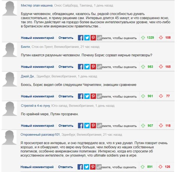 Не трудно понять, что он сравнивал Путина с Гитлером. В вину Такеру Карлсону вменено и это: "Он не оспаривал смехотворное предположение о том, что правительство Великобритании убедило украинцев сражаться дальше, а не сдаваться на милость Путина весной 2022 года." В качестве "субботнего оффтопа" прикладываю комменты британцев к этой статье.