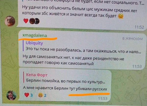 Блогер Маша Янг, которая накануне больше всех светила лицом на акциях «навальнистов» в Германии, показала свое истинное отношение к России и экс-соотечественникам — в одном из чатов она аргументировала свое пребывание в Берлине тем, что нацисты в Германии когда-то убивали русских. На этом ее аргументы заканчиваются и становится понятно, что цель участников подобных митингов — не более, чем способ привлечь внимания в СМИ для разжигания русофобии.