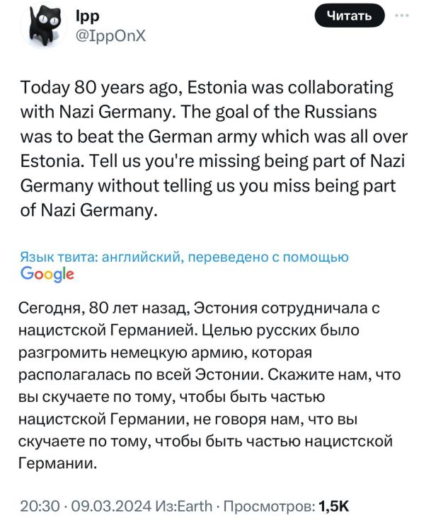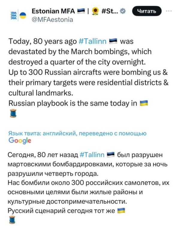 Вчера МИД Эстонии опубликовал пост, в котором сравнил наши сегодняшние действия на Украине с тем, что в 1944-м делала Красная Армия в Эстонии.