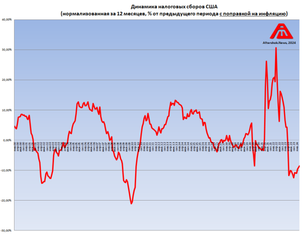 Нормализованный (усредненный) доход бюджета США с поправкой на инфляцию сокращается 12 месяцев подряд - для сравнения: после краха 2008 он сокращался 29 месяцев, а после ковидловых локдаунов 12 месяцев подряд.