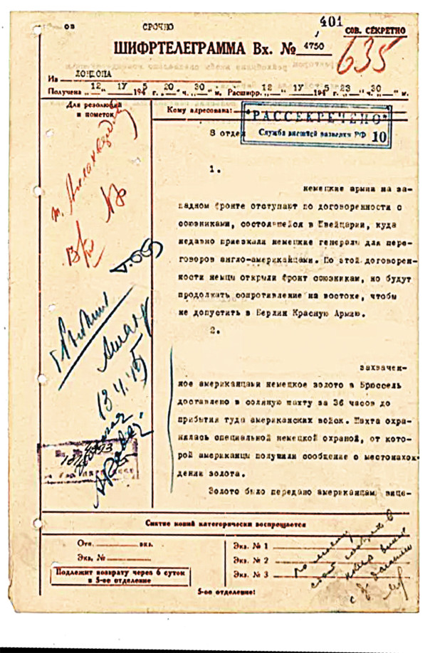 В конце 2020 г., накануне своего 100-летнего юбилея, Служба внешней разведки Россииопубликовала любопытнейший документ. Это фотокопия телеграммы, в которой шла речь о закулисных контактах Запада с нацистами незадолго до разгрома Германии. Шифровка была передана в Москву резидентурой советской внешней разведки в Британии 12 апреля 1945 г. и подписана оперативным псевдонимом «Боб».