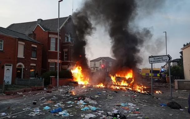 В Саутпорт съехались правые активисты и футбольные фанаты из «Лиги защиты Англии» – они устроили потасовки с полицией и подрались с мигрантами, которые бегали по городу с мачете. Досталось и полицейским машинам, которые погромили и пожгли. Как уже недавно было в Лидсе.
