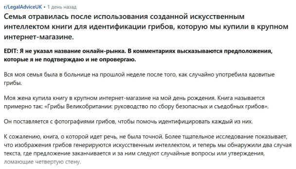 Ранее The Guardian писала, что грибников просят «избегать поиска книг на Amazon, которые кажутся написанными искусственным интеллектом», поскольку эксперты предупреждают, что они содержат вредные советы.