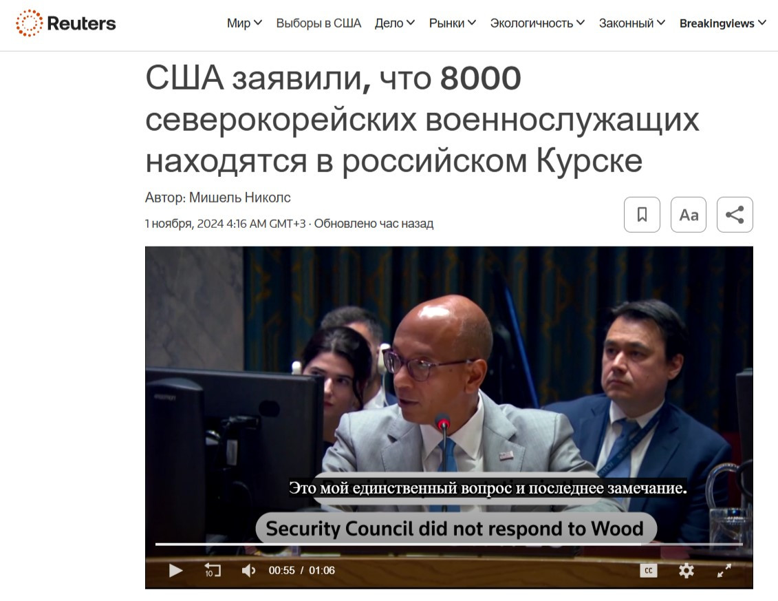 Международное сообщество серьёзно обеспокоено тем, что Россия может планировать использовать солдат КНДР против украинских сил, вещает заместитель посла США при ООН Роберт Вуд, предостерегая, видите ли, Россию «от такого опасного просчета. Участие КНДР в боевых действиях против Украины стало бы тревожным расширением конфликта. Уже сейчас развёртывание войск КНДР в России знаменует собой опасное расширение связей России и КНДР.