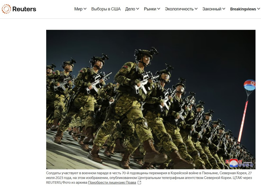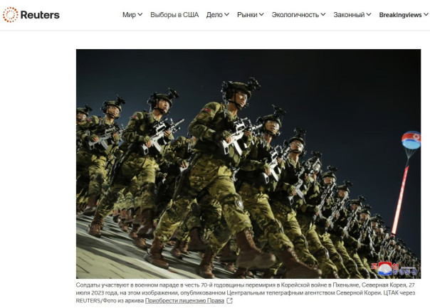 Кстати, ведущее западное агентство новостей Reuters, тиснувшее эту западную версию «плача Ярославны», само оказалось под стать этому американскому горлопану. К своему стыду, оно не нашло ничего лучшего, чем сопроводить публикацию о «присутствии северокорейских войск» в России «убедительным доказательством» в виде… фотографии солдат армии КНДР, бодро марширующих на параде в Пхеньяне!