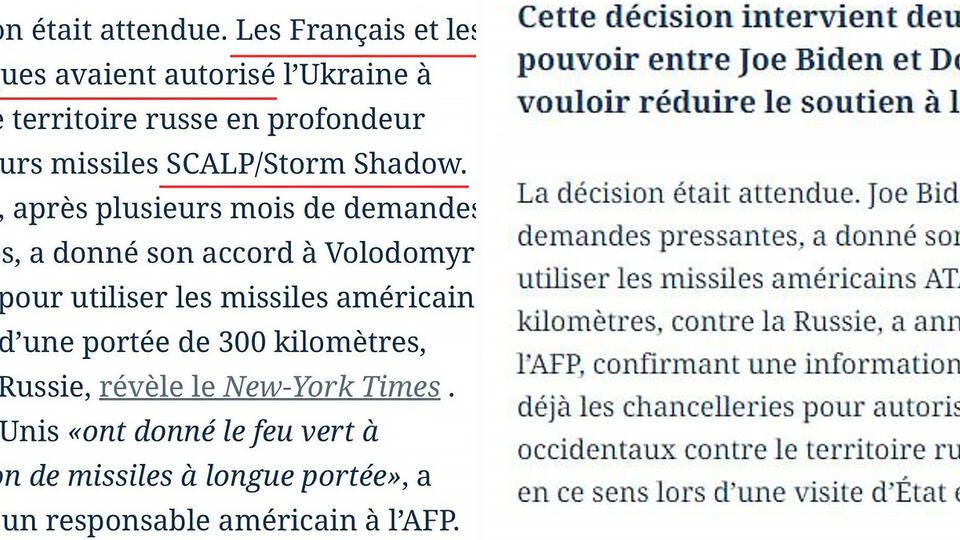В статье был кусок, в котором содержалась информация о разрешении на удары с использованием ракет SCALP и Storm Shadow, предоставленных Великобританией и Францией.
