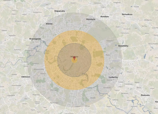 Американский журнал Newsweek описал последствия гипотетического удара США термоядерной авиабомбой B83 мощностью до 1,2 Мт по Москве, Пхеньяну и Пекину. Судя по опубликованной карте поражения взрывная волна достанет даже до Одинцово, Химок, Мытищ, Балашихи и Люберец.