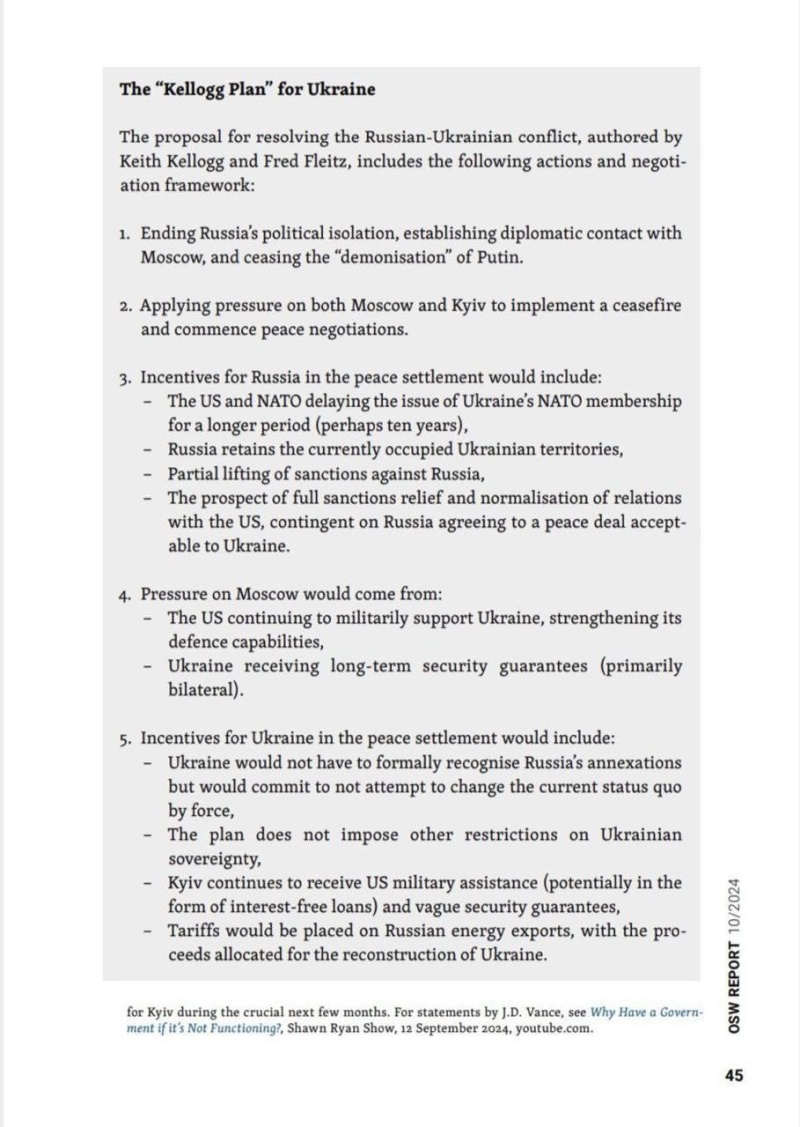 OSW Report обнародовал новый план урегулирования конфликта на Украине, который называют «планом Келлога» — 80-летнего генерал-лейтенанта в отставке, будущего спецпредставителя Трампа по Украине. Изложенное в перечне неоднократно высказывалось представителями Трампа, в том числе Келлогом, документ собрал все заявления в один текст.