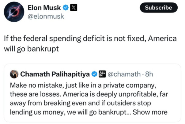 Так американский бизнесмен и глава Департамента эффективности правительства США (DOGE) Илон Маск отреагировал на пост в соцсети Х, в котором говорится, что «Америка глубоко убыточна, и, если сторонние люди перестанут давать нам деньги в долг, мы обанкротимся. Так что, если вы не знали, если вы все еще желаете краха DOGE, вы желаете дефолта Америки».
