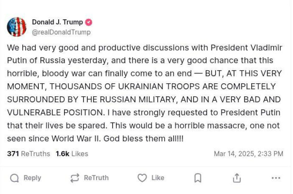 «Вчера у нас были очень хорошие и продуктивные переговоры с президентом России Владимиром Путиным, и есть очень хорошие шансы, что эта ужасная, кровавая война наконец-то закончится — НО В ЭТОТ САМЫЙ МОМЕНТ ТЫСЯЧИ УКРАИНСКИХ ВОЙСК ПОЛНОСТЬЮ ОКРУЖЕНЫ РОССИЙСКИМИ ВОЙСКАМИ И НАХОДЯТСЯ В ОЧЕНЬ ПЛОХОМ И УЯЗВИМОМ ПОЛОЖЕНИИ.