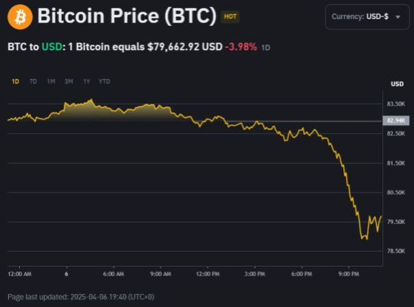 Вечером в воскресенье, 6 апреля, стоимость криптовалют резко пошла вниз. Инвесторы в панике, поскольку падение достигло 10%. По информации Reuters, курс Bitcoin упал примерно на 5% — до 78 892,92 долларов по состоянию на 18:55 по Гринвичу.