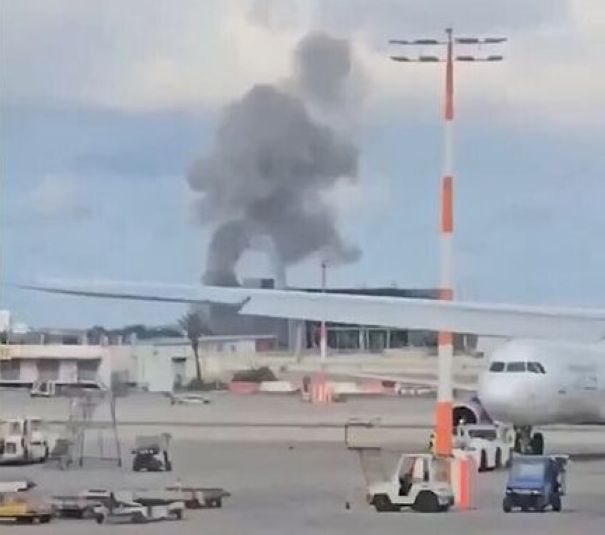 В настоящее время аэропорт закрыт. Со стороны терминала поднимается черный дым.