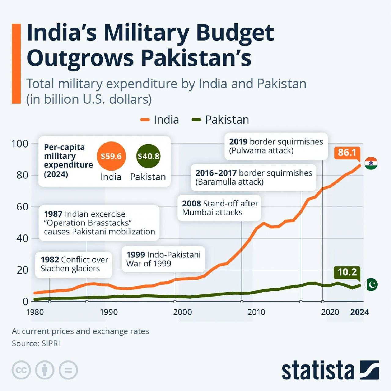 Особенно если помнить, что индийский военный бюджет превышает пакистанский в 8,5 раз, а экономический разрыв между странами — колоссален: Индия в 12 раз богаче по ВВП, валютные резервы — в 60 раз больше, экономика растет со скоростью 6-9% в год. Пакистан же в последние годы живёт в режиме перманентного кризиса: инфляция, обесценивание рупии, зависимость от МВФ, протесты, политическая нестабильность.