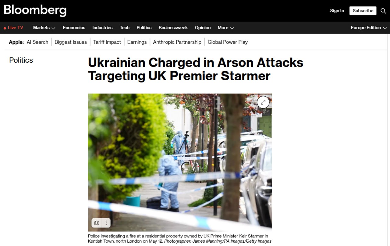 Гражданину Украины предъявлены обвинения по трем пунктам поджога после серии пожаров в домах, связанных с премьер-министром Великобритании Стармером, — Bloomberg.