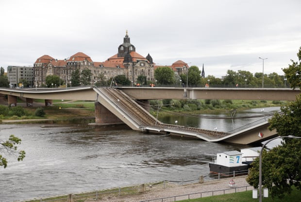 Дрезден. Мост "Карола" над Эльбой вежливо дождался пока проедет трамвай и через 10 минут решил искупаться, прыгнул в реку. Власти назвали это чудом, ведь никто не погиб, но, возможно, горожане теперь смотрят на старые мосты как на спящих врагов.