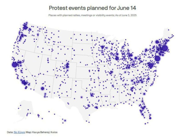 В США готовятся к общеамериканскому майдану, камуфлируемому под новые масштабные протесты против Трампа. Акция под названием "Без королей" – с явным намёком на «бонапартизм» Трампа – должна охватить более 1800 городов во всех штатах. Соответствующая карта уже опубликована изданием Axois: