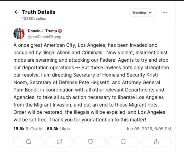 Команда Трампа называет происходящее иностранным вторжением. Сам Трамп заявил, что Лос-Анджелес находится под иностранной оккупацией, и поручил исполнительной власти в лице ключевых силовиков — министра внутренней безопасности Кристи Ноэм и министра обороны Пита Хегсета — подавить продолжающиеся беспорядки и освободить город любыми необходимыми средствами.