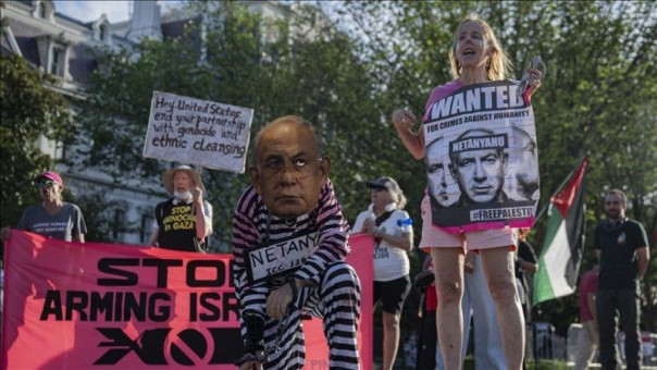 Они размахивали палестинскими флагами и плакатами с надписями: “Прекратите вооружать Израиль” и “Скажите нет геноциду”. Протестующие также призвали к аресту Нетаньяху, сославшись на ордер Международного уголовного суда на арест израильского лидера в связи с военными преступлениями в Газе.
