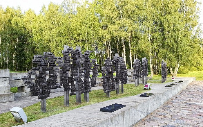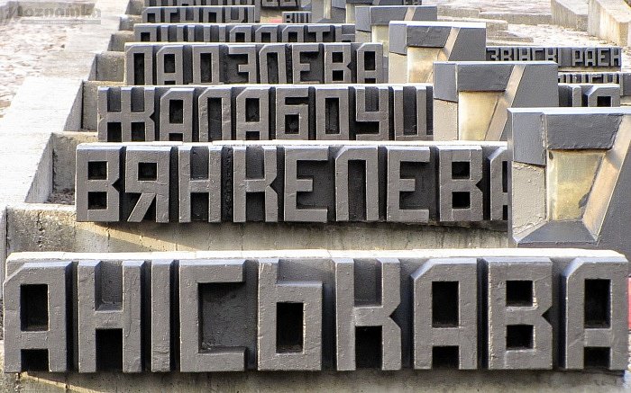 «Стена памяти», на которой установлены таблички с названиями более 260 лагерей смерти, находящихся на территории Беларуси во время войны и количество погибших белорусов в каждом из них.