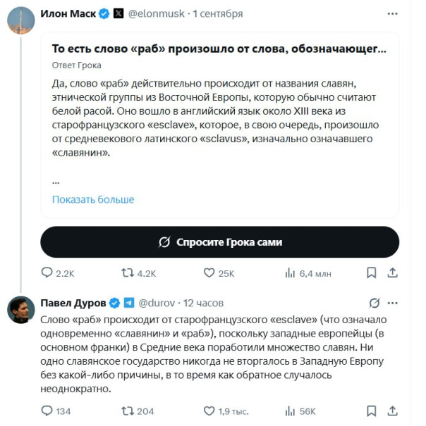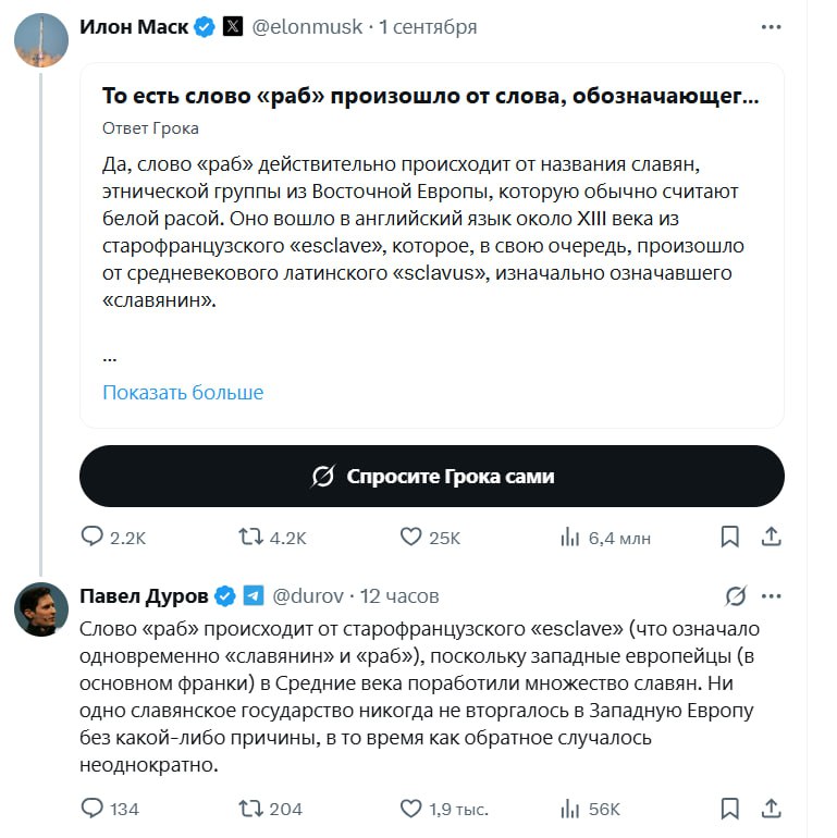 Основатель Telegram вышел в X с критикой европейского обычая раз в сколько-то лет устраивать поход на Восток, в частности — на славян. Комментируя переписку Илона Маска с его нейросетью, Дуров отметил, что ни одно славянское государство не вторгалось в западноевропейские страны без причины, а вот, наоборот, происходило очень часто.