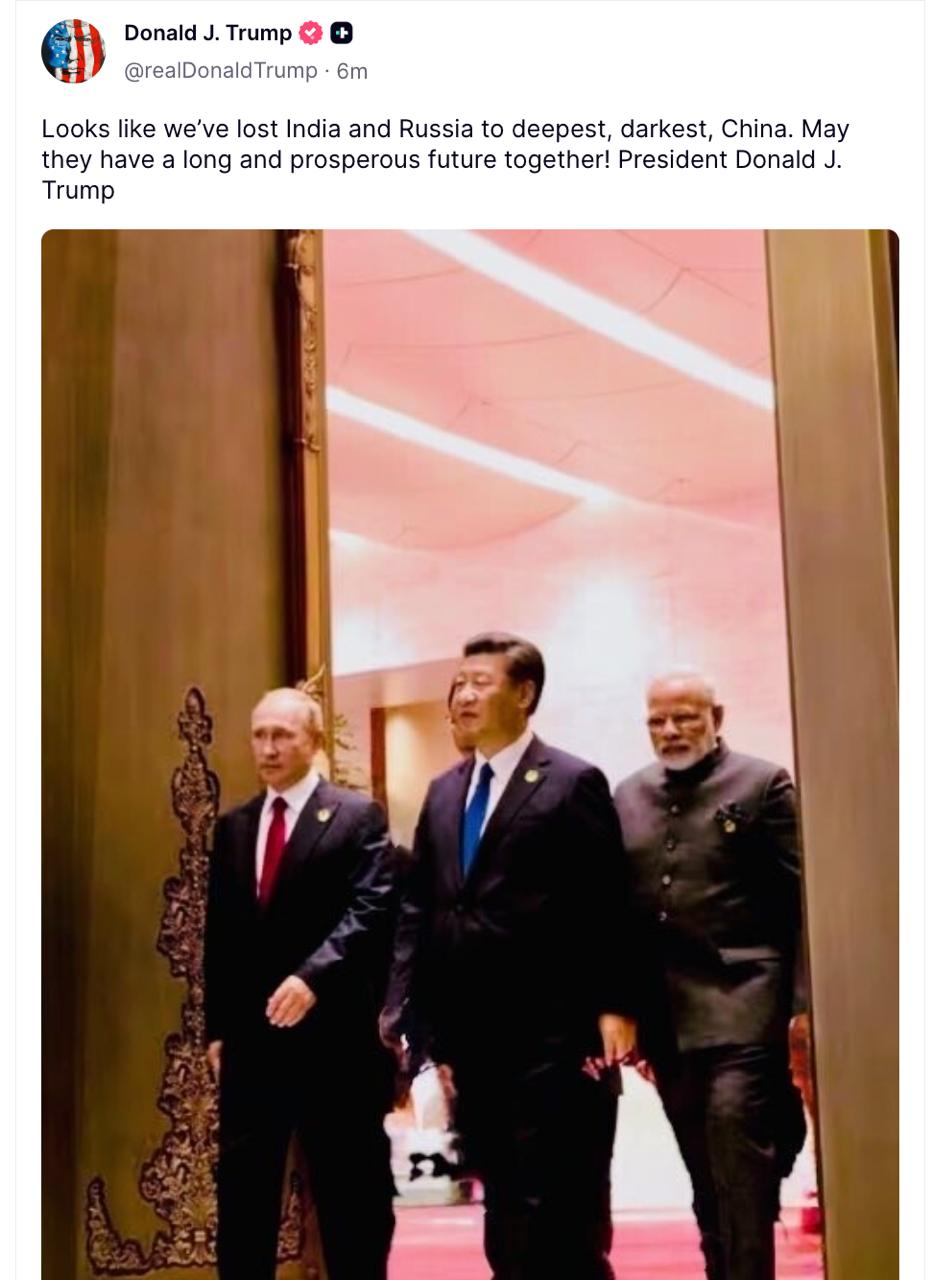 «Похоже, мы потеряли Индию и Россию из-за Китая, самого глубочайшего и темнейшего. Пусть их ждет долгое и процветающее будущее вместе!», — написал Трамп.