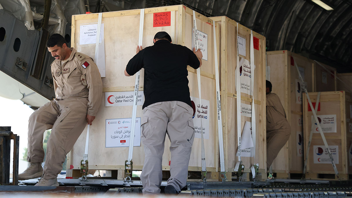 Военнослужащие катарских ВВС разгружают гуманитарную помощь в аэропорту Дамаска, 7 сентября 2025 года