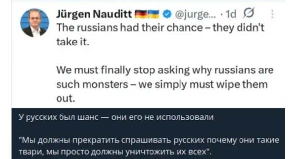 Когда слышу как немецкие политики на своем языке говорят о том, что не хотят никакого мира и хотят воевать до последнего украинца, то реально кажется будто какой-то коллективный Гитлер пробудился.