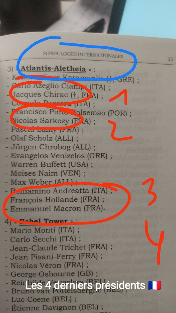 "Эммануэль Макрон является идеальной преемницей Олланда... уже будучи банкиром Ротшильдов, он был консультантом, а затем министром того же Олланда. Кроме того, он является любимцем[любовником по вызову] масона Жака Аттали… Лично Макрон хвастается своим масонским членством в Ur-lodge (суперложа) "зеленое братство", куда его привел Олланд, и в суперложе "Атлантида Алетейя"… Его наставник Аттали, утонченный масон, выдающийся интеллектуал, который работал на левоцентристов и участвовал в строительстве этой технократической и олигархической Европы... косметическая операция, которая привела Макрона в Елисейский дворец"
