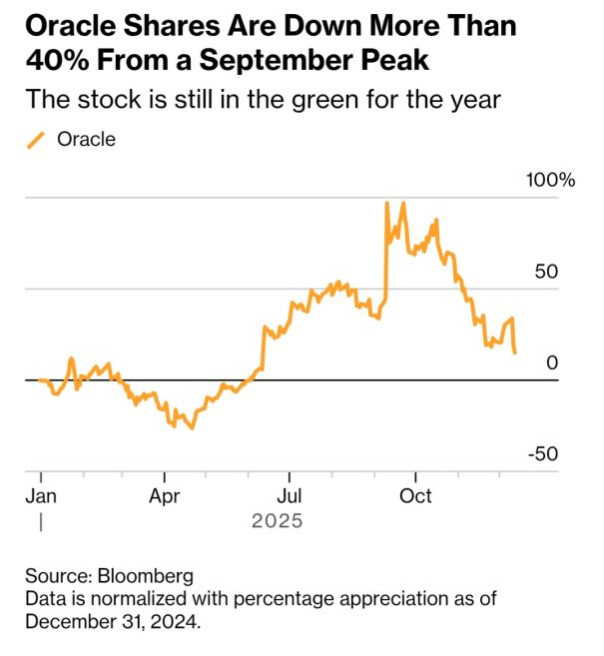 Акции Oracle резко упали в четверг после того, как компания сообщила о значительно более высоких капитальных затратах, чем ожидалось, во втором финансовом квартале, а рост облачных продаж не оправдал средних оценок аналитиков. В пятницу появилось сообщение о том, что некоторые проекты центров обработки данных, которые компания разрабатывает для OpenAI, были отложены, что привело к дальнейшему падению акций Oracle и оказало давление на другие акции, связанные с инфраструктурой искусственного интеллекта. Между тем, оценка кредитного риска Oracle достигла самого высокого уровня с 2009 года.