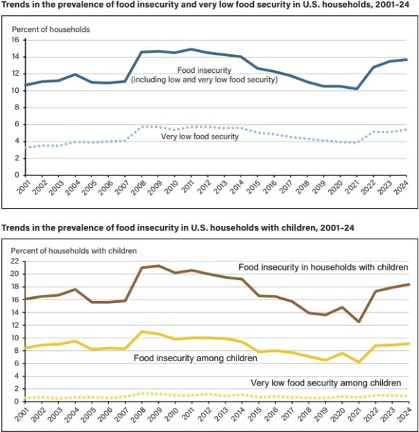 Недавно Министерство сельского хозяйства США порадовало нас своим докладом о продовольственной безопасности американцев, эти исследования проводятся начиная с 1990 года и публикуются ежегодно. Оказалось, что в 2024 году почти 14% американских семей испытывали трудности с доступом к еде, это самый высокий показатель за последнее десятилетие, из них более 5% имеют "очень низкий уровень продовольственной безопасности", где фактически ситуация достигла уровня голода.