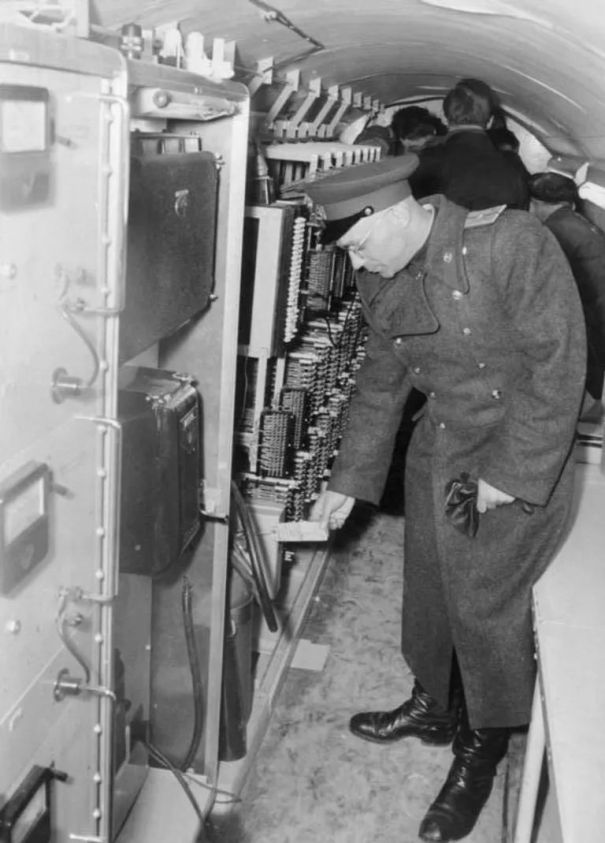 Офицер группы советских войск в Германии указывает на английские надписи на оборудовании в обнаруженном тоннеле