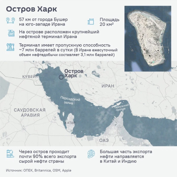 «Захват США острова Харк может быть символическим жестом, показывающим возможность Вашингтона провести сухопутную операцию против Тегерана. Трамп может сказать, что якобы на этой территории найдена секретная база. Сами нефтяные терминалы США не нужны. Трампу лучше, чтобы там все хорошо функционировало, чтобы мировой рынок насыщался. Израилю тоже выгодно, чтобы Иран не получал экспортные выручки и не смог восстановить в ближайшие годы свою экономику. Для Трампа это еще и возможность лишить Китай дешевой иранской нефти, потому что она была под санкциями и продавалась Пекину со скидками», — сказал Юшков.