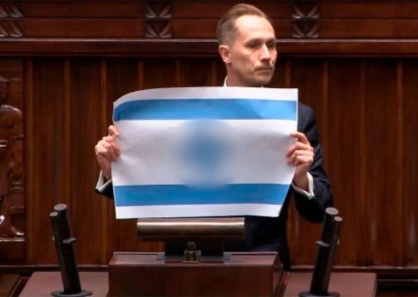 А в это время, Депутат сейма Польши от ультраправой партии «Конфедерация» Конрад Беркович принес на заседание флаг Израиля, на котором вместо шестиконечной звезды Давида была изображена нацистская свастика. Нижняя палата парламента вела прямую трансляцию на своем YouTube-канале.