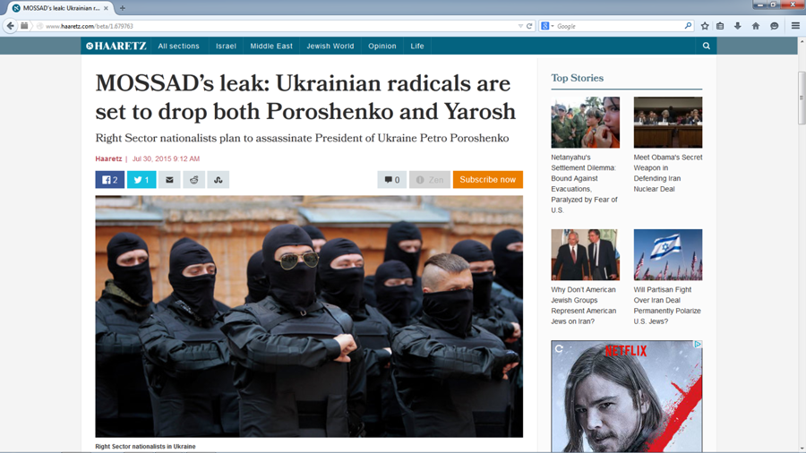 На сайте израильской газеты Хаарец в 9:12 утра 30 Июля 2015 года появилась статься о том, как националисты из «Правого сектора» готовят покушение на украинского президента Порошенко.