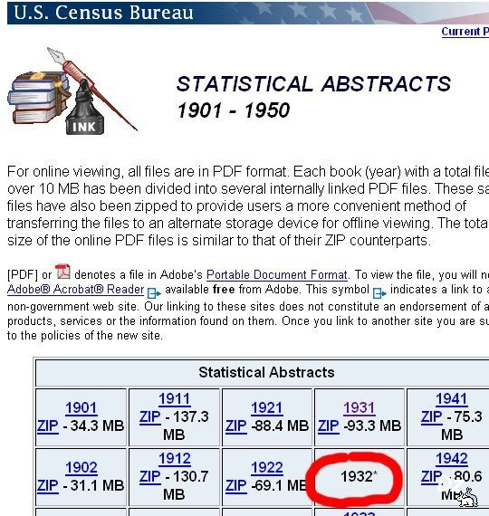 Попытка ознакомиться с официальной демографической статистикой США ошеломляет с самого начала : данные статистики за 1932 год уничтожены – или очень хорошо спрятаны.** Их просто нет. Без объяснений причин. Да , они появляются позже, в статистике более поздней, в виде ретроспективных таблиц. Изучение этих таблиц также приводит внимательного исследователя в некоторое изумление.