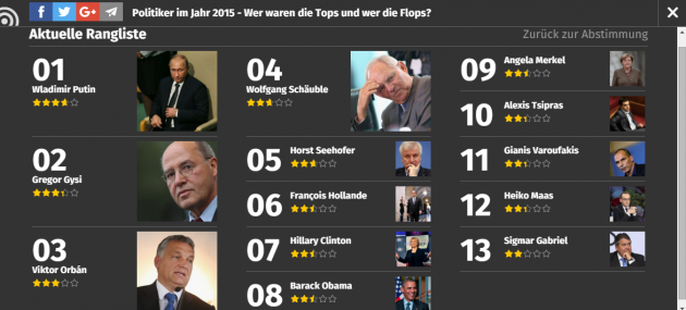 Как говорится на немецком ресурсе web. de, опрос проводится с 20 декабря 2015 года. Любой желающий может выразить свое мнение, поставив тринадцати политикам оценку по пятибалльной шкале. «За тех, кто вдохновил вас политически, ставьте пять звезд. Неудовлетворительной для политиков оценкой является одна «звезда», — сообщается на сайте.